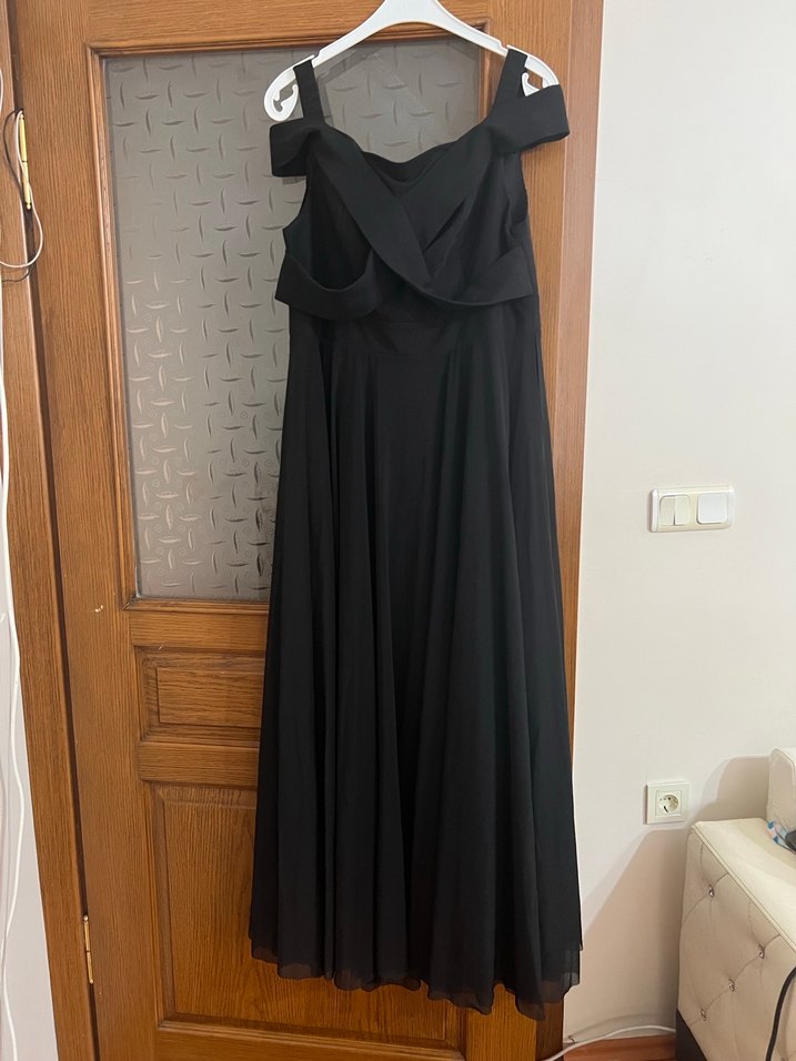 Siyah uzun abiye elbise, kayık yaka ve drapeli detaylara sahiptir. Kolsuz ve bol kesimdir, gotik tarzda klasik bir şıklık sunar.