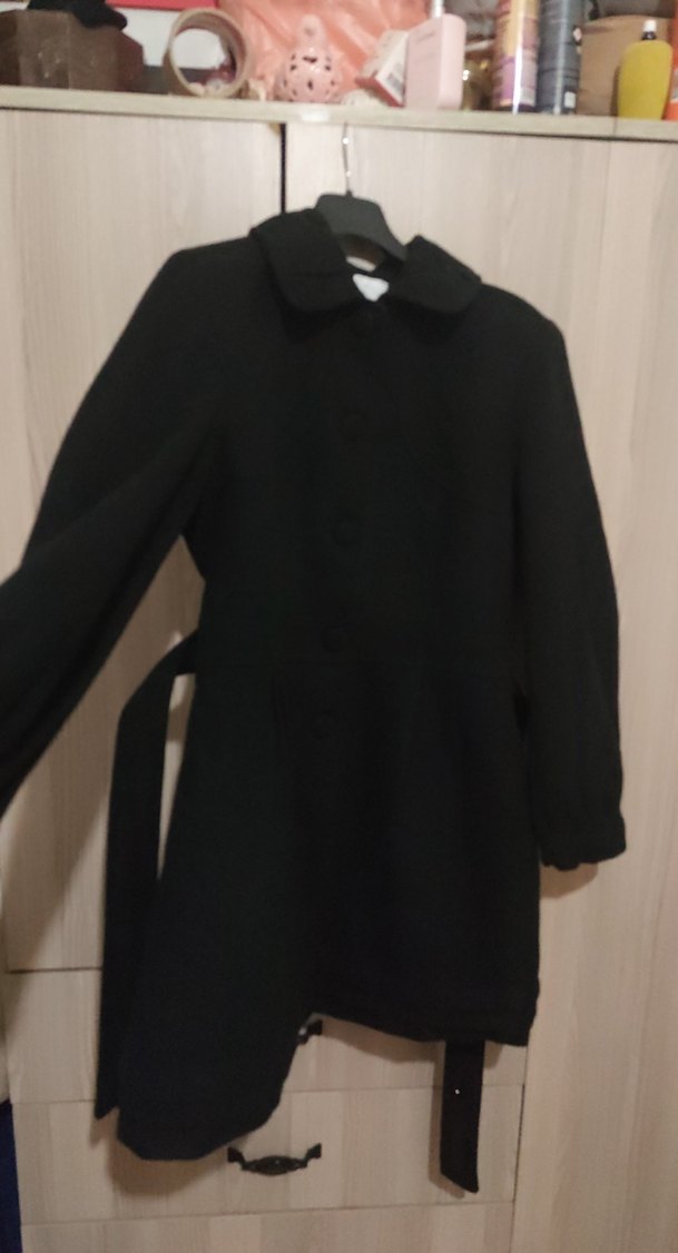 Siyah uzun kaban, kemer ve klasik yaka detaylarına sahiptir. Soğuk havalar için sıcak tutan yumuşak dokulu kumaştan üretilmiştir.