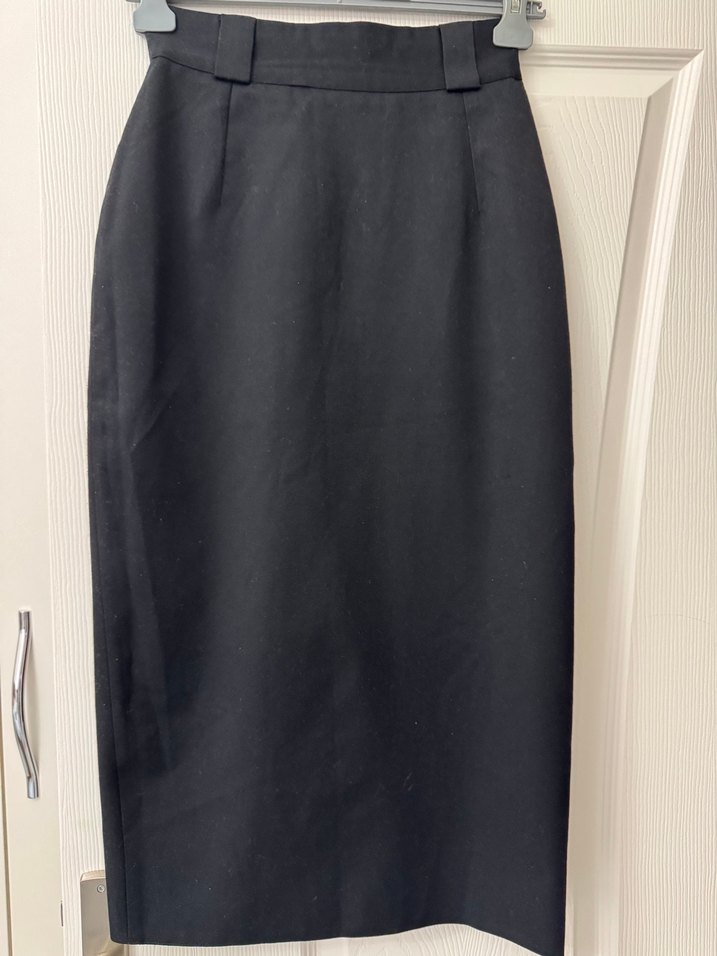 Siyah renkte, kemerli ve regular fit uzun kadın eteği. Gabardin kumaştan üretilmiş, iş ve ofis ortamlarına uygundur. Kumaşı kalın Gabardindir. Astarlıdır. Bel:34cm .uzunluk:84 cm. bütün hatları kamufle eder. Çok zayıf gösteren bir tarzı vardır. 1.2 defa giyilmiştir.
