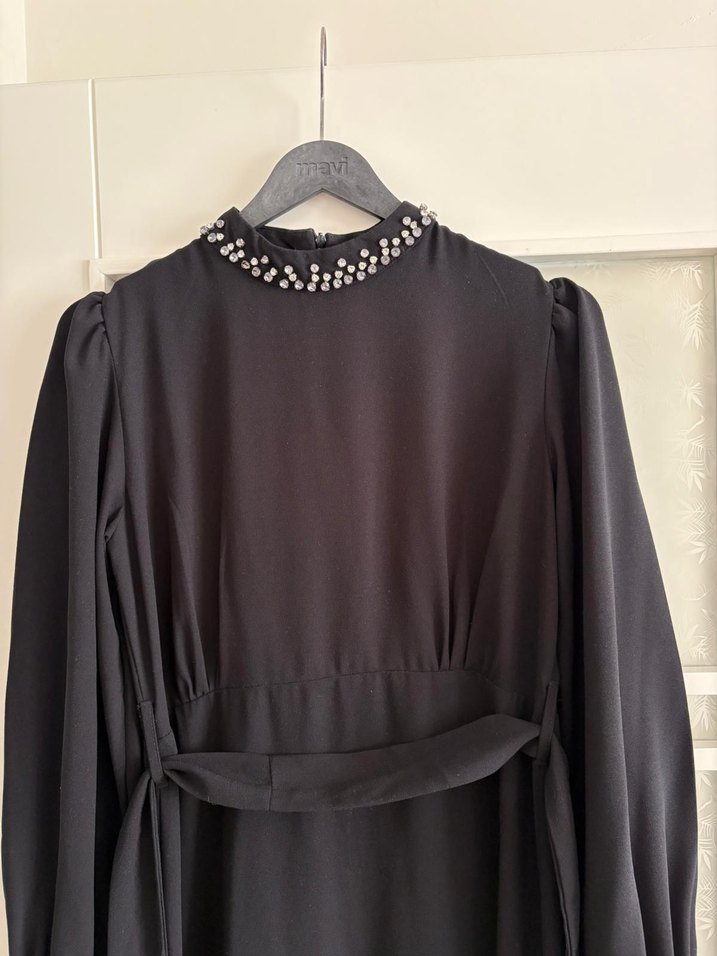 Boncuk detaylı yüksek yakalı, kemerli, uzun siyah elbise. İnce askılı kolları ve klasik gotik tarzı ile ofis için uygun.