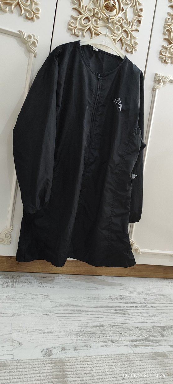 siyah uzun kesim bol kesim, uzun kollu ve yüksek yakalıdır. Sentetik kumaştan yapılmış ve drapeli tasarıma sahiptir. belli ayarlanabilir lastikli tesettür mayo