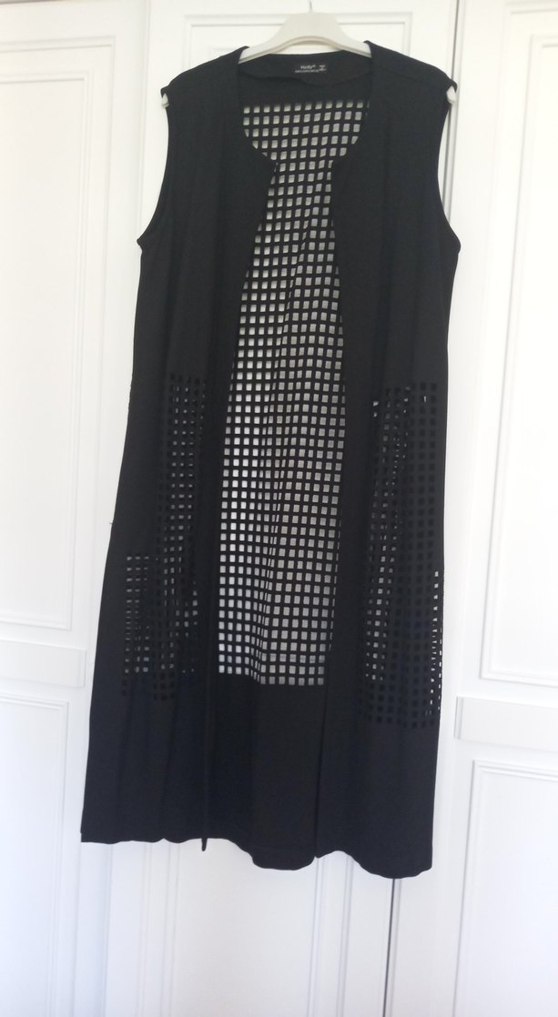 Siyah, uzun kesim ve V yaka kadın yeleği, sentetik kumaştan ve regular fit. Yırtmaç detayları ve minimalist, avant-garde gotik tarzıyla günlük kullanıma uygun.