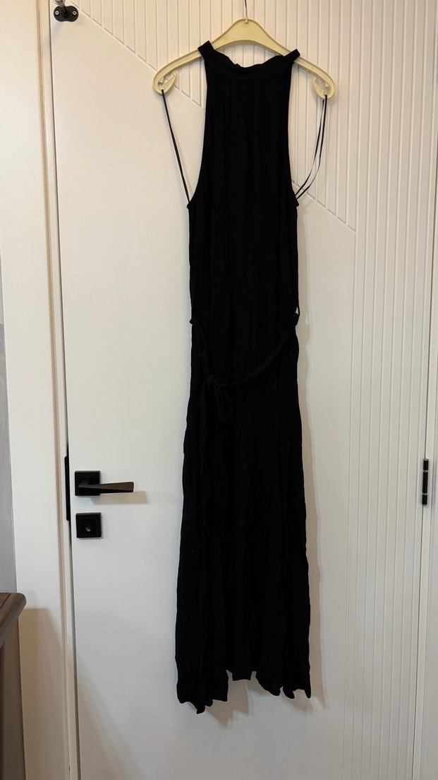Siyah Uzun Keten Drapeli Halter Yaka Elbise