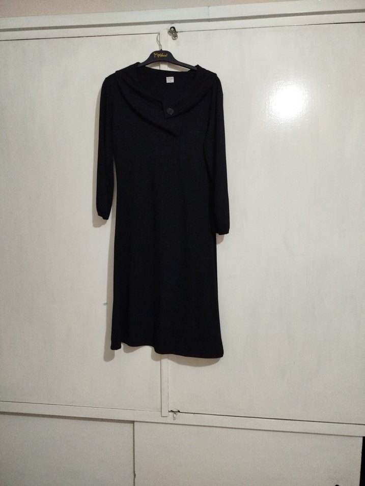 Siyah güzel bir kumaştan, uzun kollu ve düğmeli, V yakalı, kadın elbisesi. Minimalist gotik tarzda, klasik zarafet sunar. Günlük ve ofis için kullanıma uygundur.