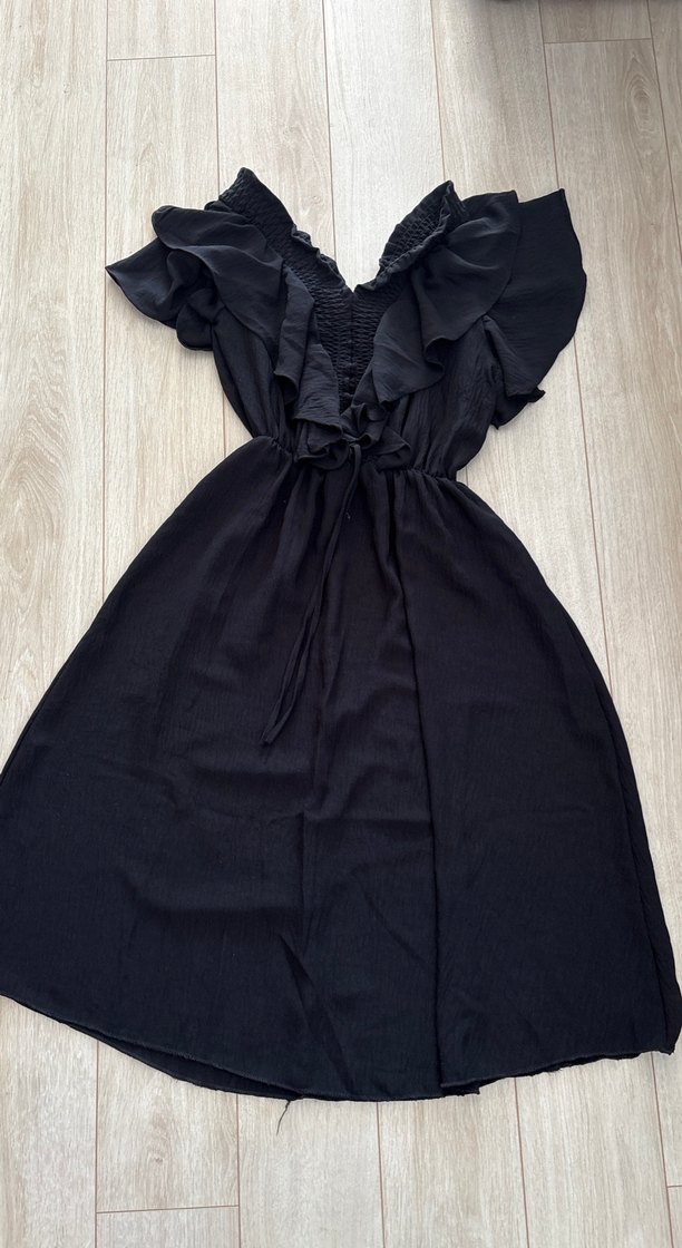 Siyah uzun keten elbise, V yakalı ve fırfır detaylıdır. Gevşek kesimi ve ince askılı kollarıyla gotik tarzı ve klasik zarafeti yansıtır. Günlük kullanıma uygundur.