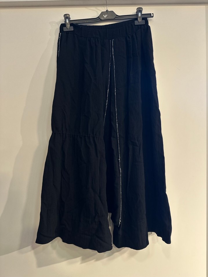 Siyah uzun keten etek, salaş kesim ve drapeli tasarıma sahip, günlük kullanım için uygun gotik tarzda.