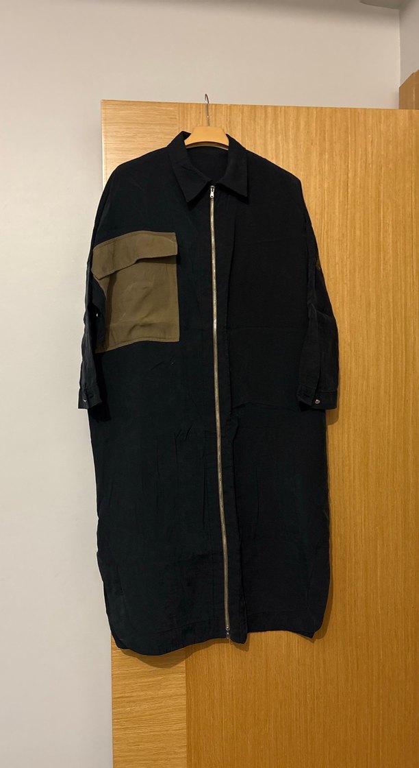 Siyah uzun keten ceket, fermuarlı ve bol kesimdir. Uzun kollu, yakası kesik ve kontrast cepli, sokak stili için uygundur. Bol kesimdir salaş modeldir 38-44 beden uyumludur