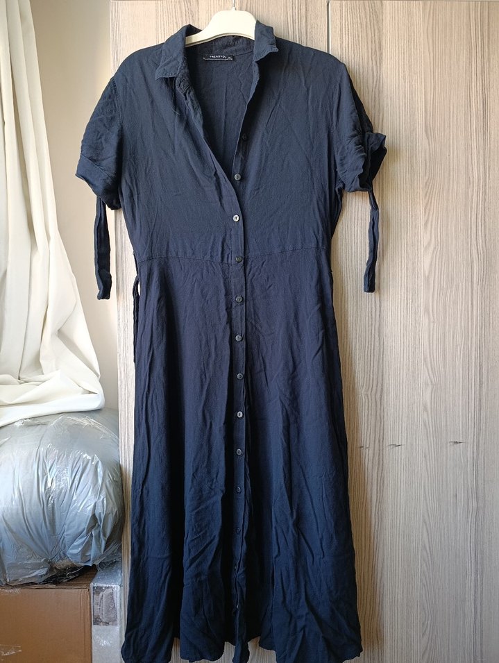 Siyah uzun keten elbise, yakalı ve düğmeli ön tasarıma sahiptir. Kısa kollu ve bağcıklı, bol kesim günlük rahat kullanıma uygundur.