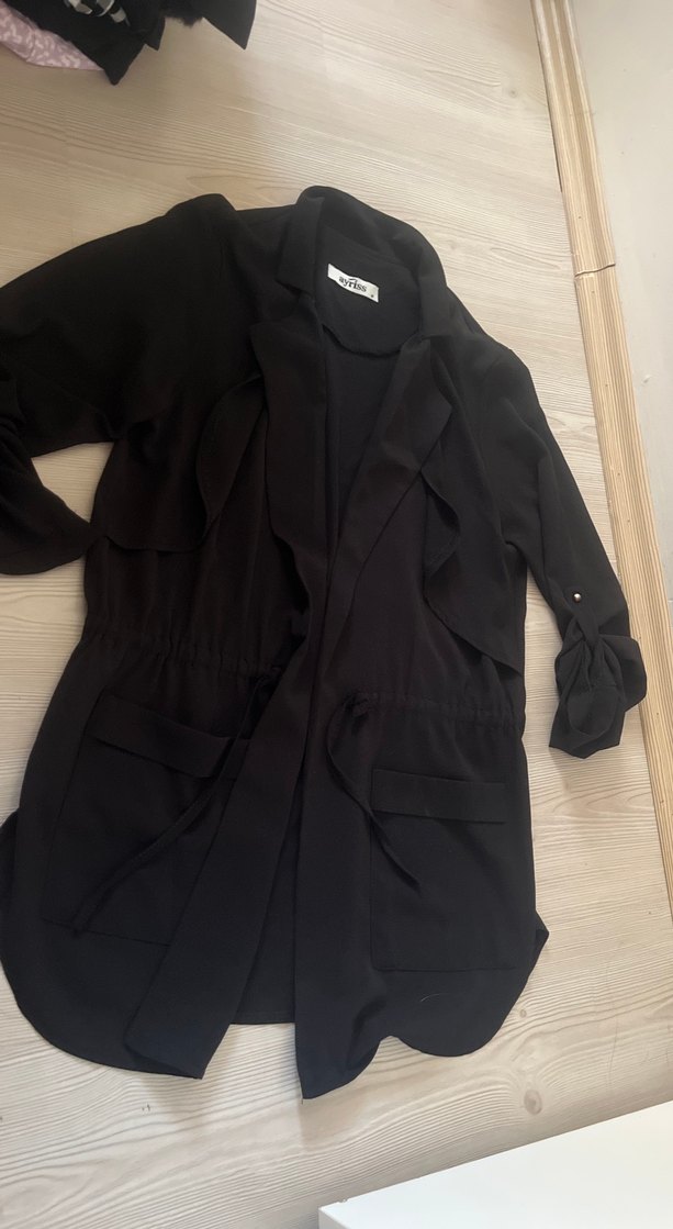 Siyah uzun keten kumaştan, bol kesim ve yakalı kadın ceket. Drapeli tasarımı ve uzun kollu yapısıyla ofis kullanımı için uygundur.