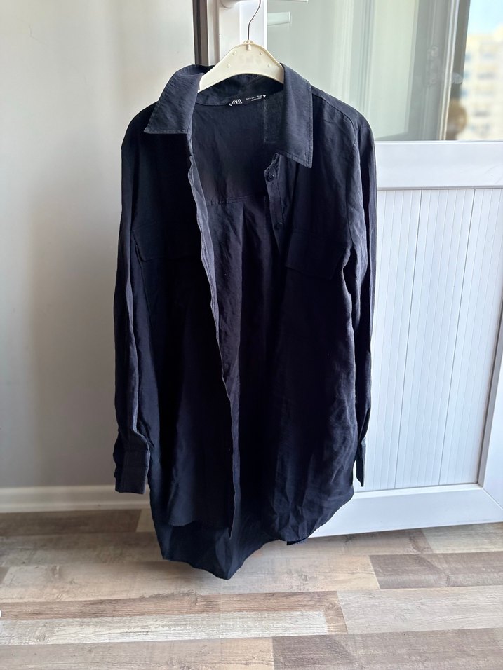 Siyah Uzun Keten Kadın Gömlek zara