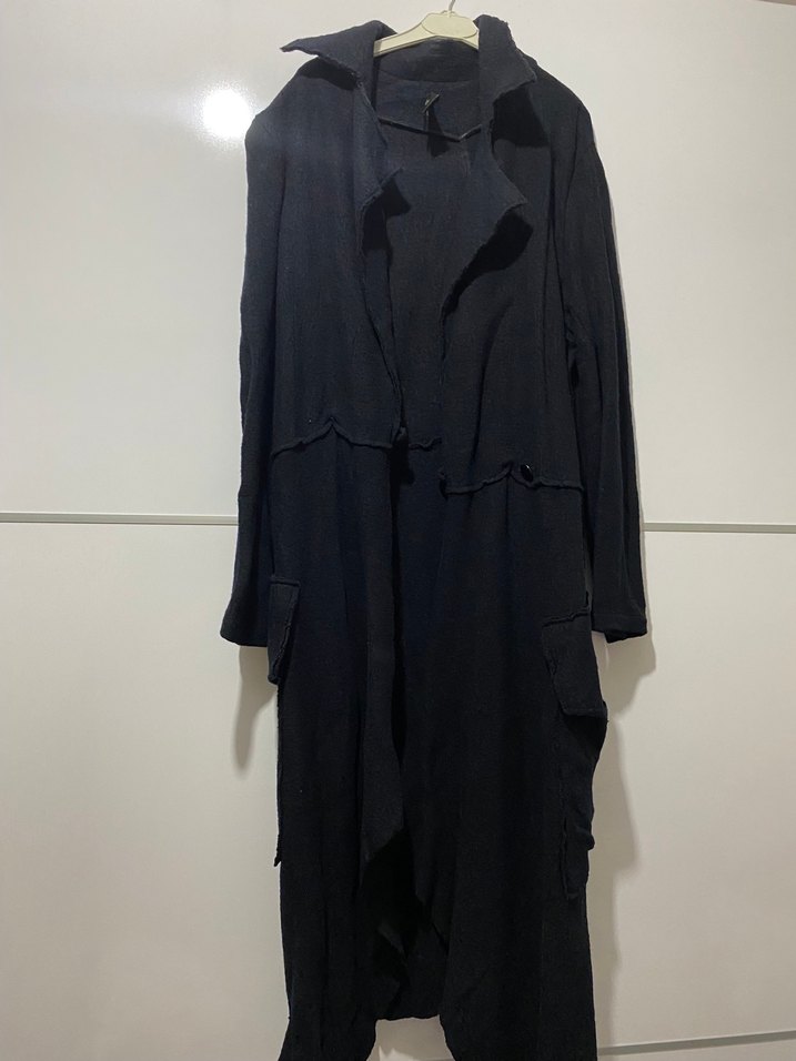 Bol kesim siyah keten kaban, drapeli detaylı ve kesik yaka ile. Uzun kollu ve desensiz, avangart tarz için uygun.