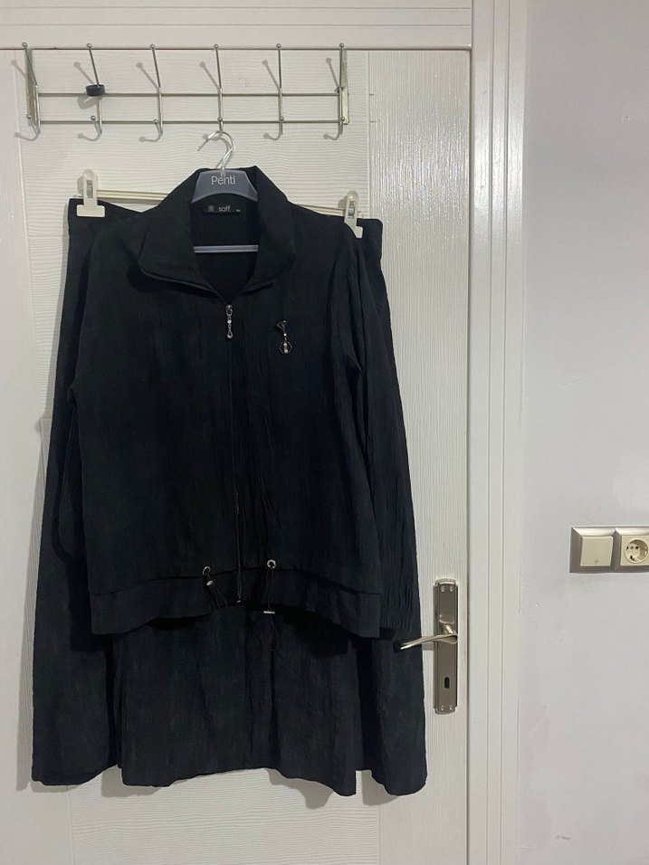 Bu siyah kadın takımı, uzun ve bol kesimi, yüksek yakası ve uzun kollarıyla dikkat çeker. Keten kumaştan üretilmiş, bel kemeri ile sokak stilini yansıtır, günlük kullanım için uygundur. 1 defa giyildi