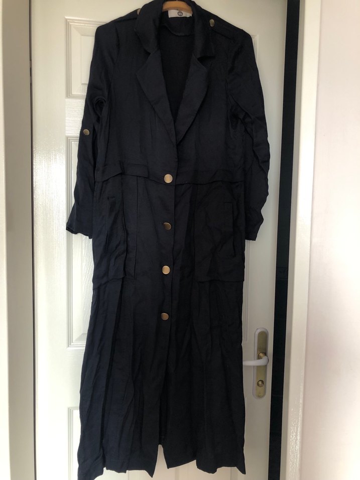 Siyah uzun keten kadın trençkot, düğmeli ön ve kesik yaka detaylıdır. Regular fit ve uzun kolludur, Paris sokak modasını yansıtır. Elbise yazlık güzel canlı renkli bir kumaş ,kolları uzun ama istenirse katlanarakta kullanılabiliyor sorunsuz temiz ürün ütülenmesi yeterli boy 120 göğüs 47 cm