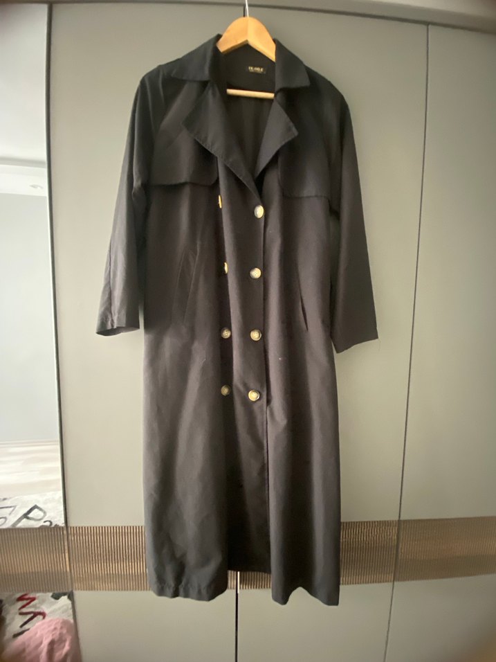 Siyah uzun keten trençkot, düğmeli ve kesik yaka detaylıdır. Salaş kesimi ve uzun kollarıyla klasik şıklık sunar, ofis için uygundur.
