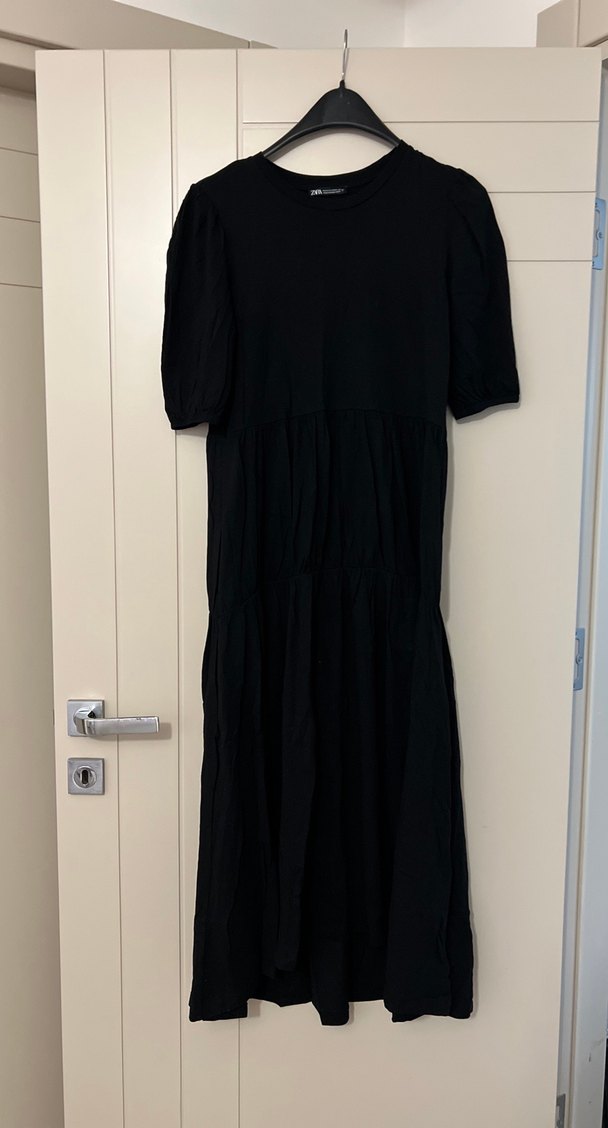 Siyah, keten kumaştan uzun, kısa kollu, yuvarlak yakalı, salaş ve drapeli elbise. Minimalist gotik tarzda, günlük kullanıma uygun. Göğüs eni 45 cm