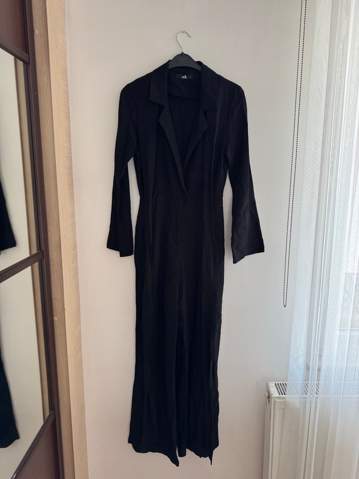 Siyah uzun keten tulum, notched yaka ve drapeli tasarıma sahiptir. Uzun kollu, regular fit ve minimalist gotik stilindedir. Ofis için uygundur. Düğünlerde giyebilirsiniz.