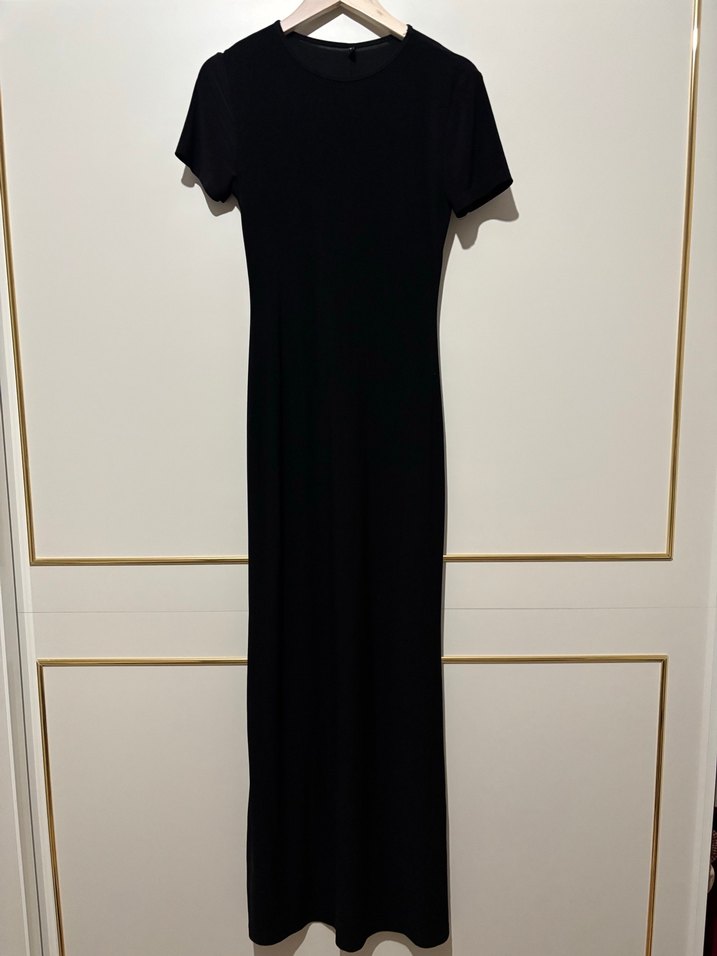 Siyah uzun elbise, kısa kollu ve yuvarlak yaka tasarımıyla, dar kesim ve düz yapısıyla klasik ve şık bir görünüm sunar. Ofis için uygundur. Hiç kullanılmadı