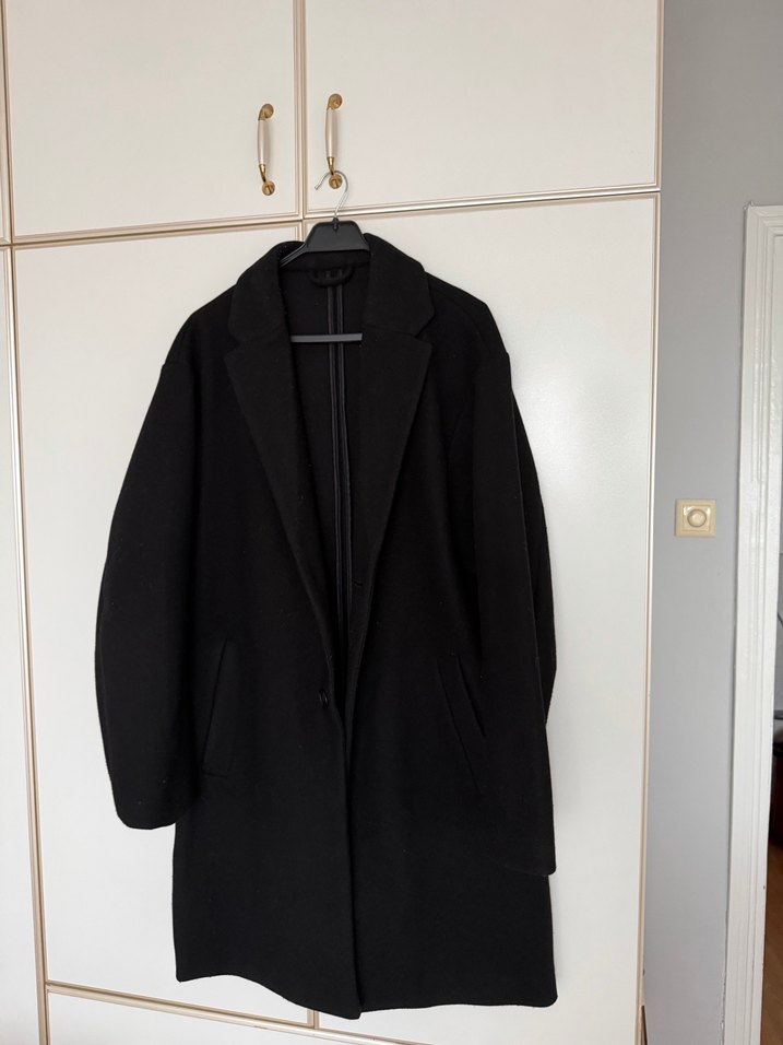Siyah uzun kaban, klasik yakalı ve tek düğmeli kapamalı, sıcak ve yumuşak kumaştan üretilmiştir. Soğuk havalar için zamansız bir modeldir.
