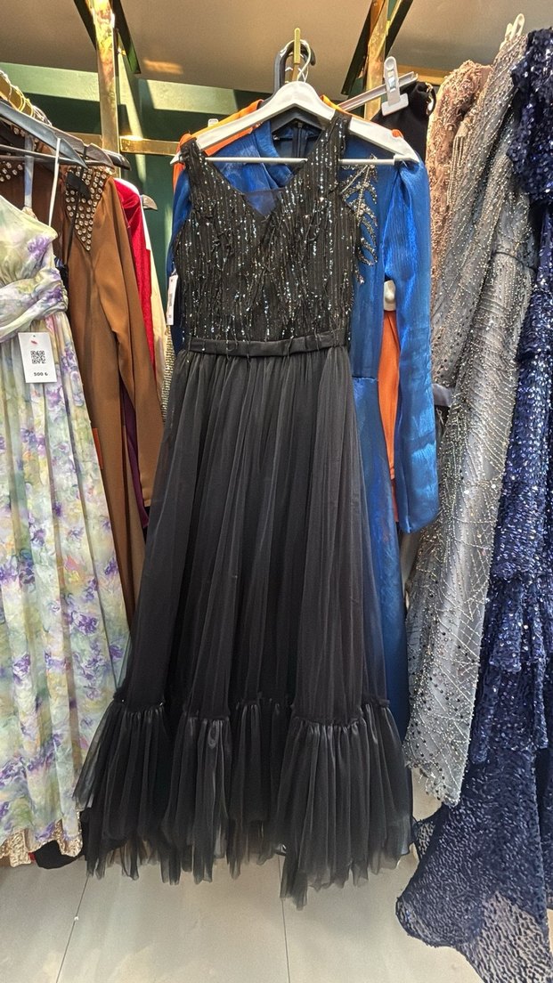 Siyah, işlemeli, uzun ve pileli etekli, kolsuz, tekne yakalı, vücuda oturan abiye elbise, parti için uygundur.