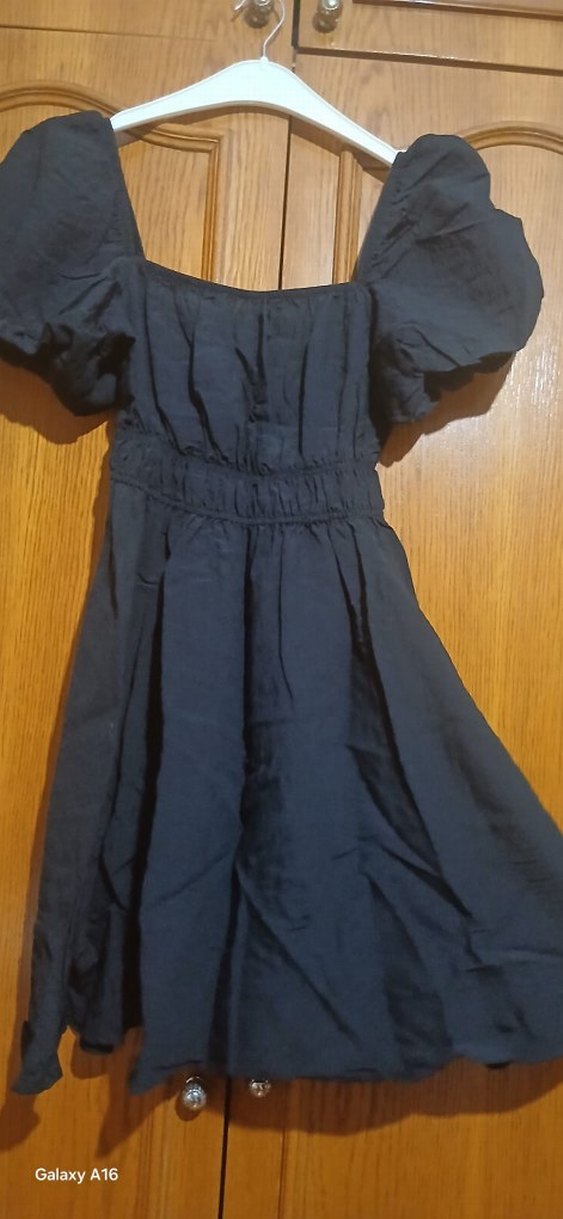 siyah, bol kesim, drapeli uzun kız çocuk elbisesi. Tekne yaka ve kısa kollu, nefes alan keten kumaştan yapılmıştır, günlük kullanım için uygundur.