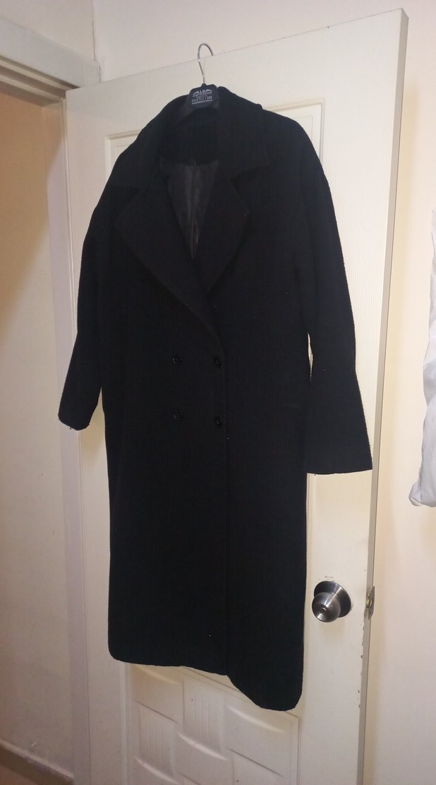 Siyah uzun kaban, klasik çift düğmeli ve geniş yaka detaylarıyla zamansız bir tarz sunar. Sıcak ve yumuşak kumaştan üretilmiştir.