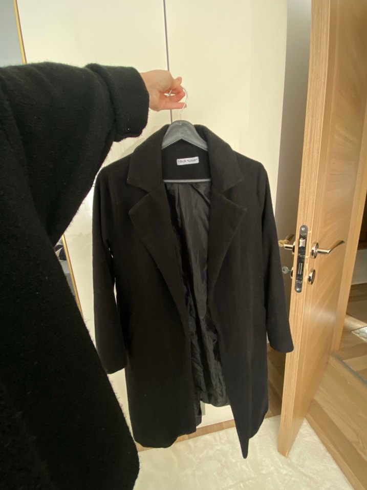 Siyah uzun kaban, klasik yakalı ve düzgün iç astarlı, serin günler için şık ve sıcak bir katman sağlar.