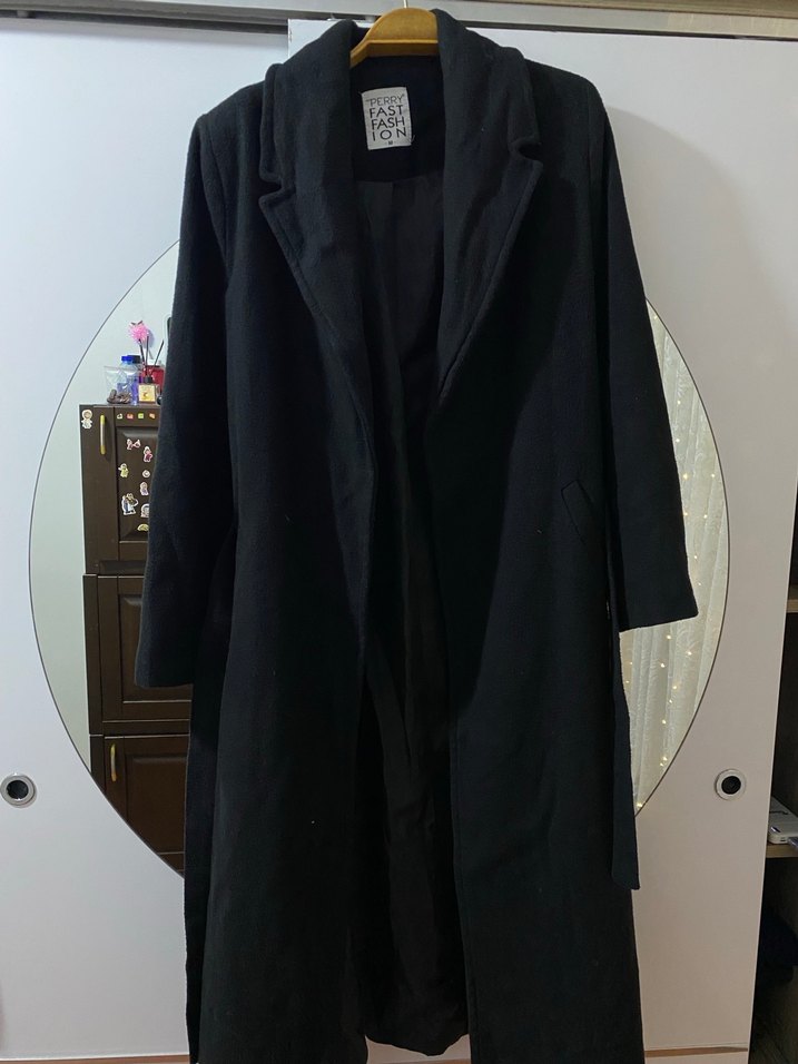 Yumuşak dokulu, uzun siyah klasik kaban, soğuk havalar için uygun.