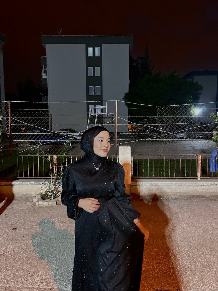 Siyah Uzun Kol taşlı Saten Elbise