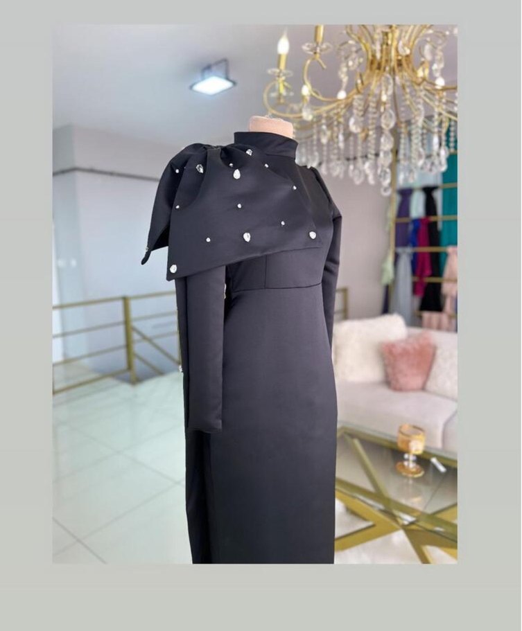 Siyah uzun kol, yüksek yakalı, drapeli ve nakışlı detaylara sahip abiye elbisedir. Avant-garde tarzda, düğünler için uygundur. bir kere tek giyildi tertemiz