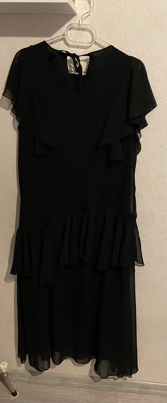 Siyah uzun elbise yüksek yakalı ve fırfır detaylıdır. Salaş kesim ve ipeksi dokusu ile gotik tarzda klasik şıklık sunar. Kolsuz ve desensizdir.