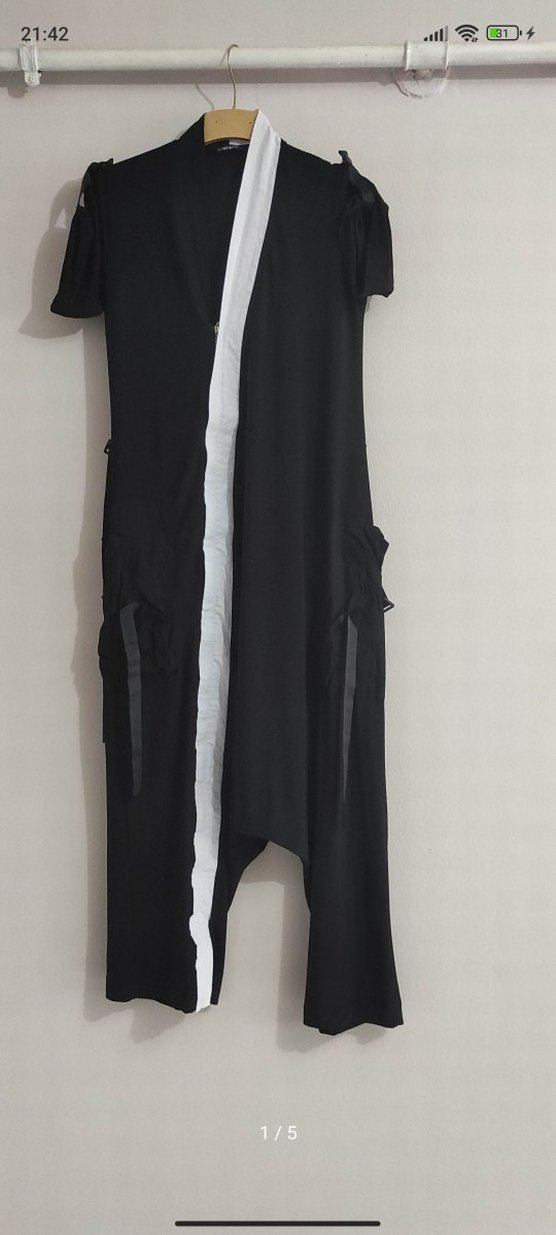 Siyah, kollarsız, geniş kesim uzun tulum. Yaka kısmı çentikli. Pürüzsüz sentetik kumaştan, günlük kullanıma uygun avant-garde gotik tarzda.