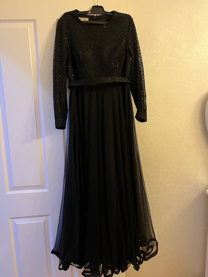 Siyah uzun kollu, salaş kesim abiye elbise. Üst kısmı hafif ışıltılı ve drapeli, etek kısmı ise özgürce akan tasarıma sahip.