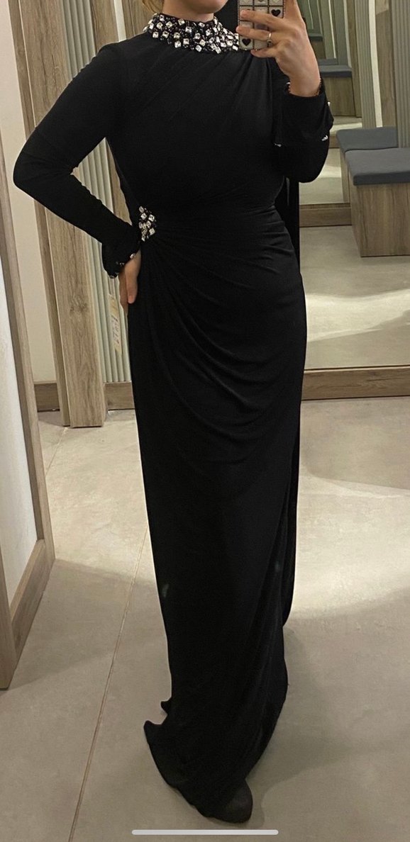 Siyah, uzun kollu ve drapeli detaylara sahip, gövdeyi saran şık abiye elbisedir. Düğün ve özel davetler için uygundur.