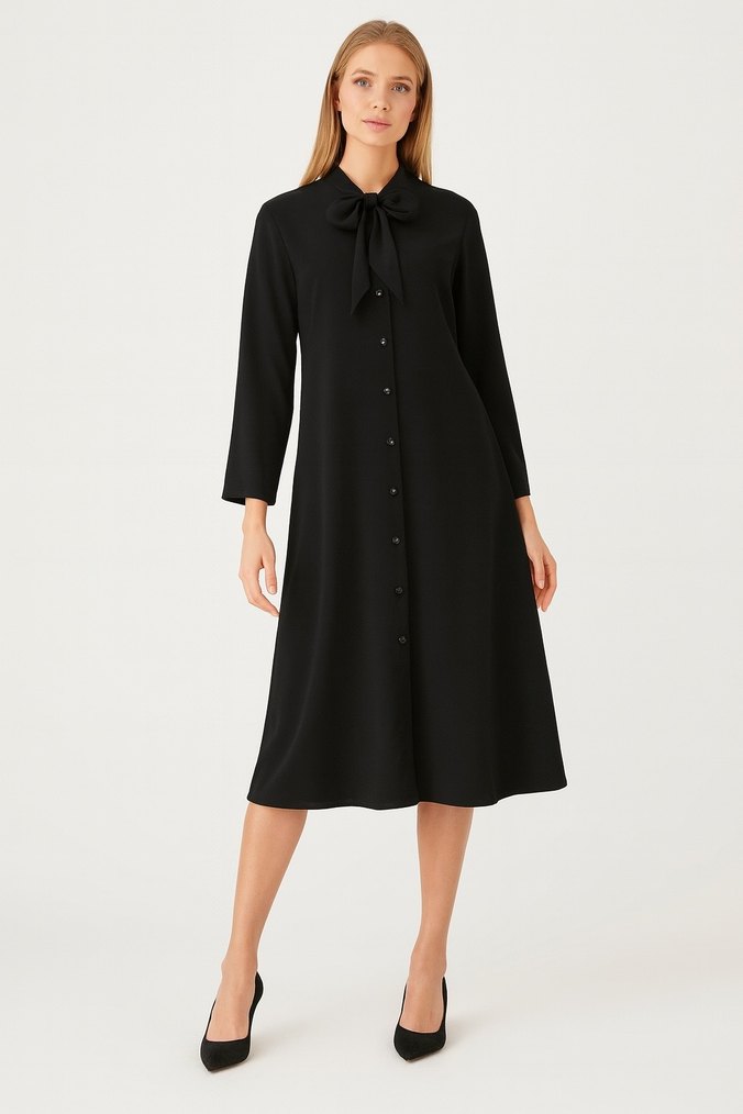 Siyah uzun kollu elbise, düğmeli ön ve kesimli yaka detayına sahiptir. Ofis için uygun, rahat kesim ve sentetik kumaştan üretilmiştir.