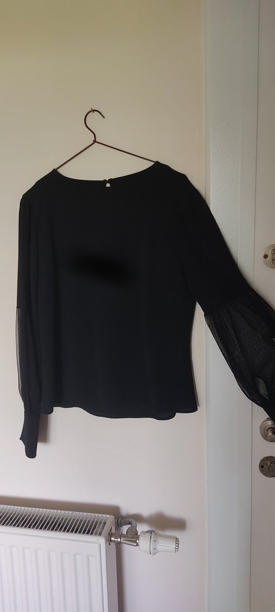 Siyah, uzun kollu, yuvarlak yakalı ve bol kesim bluz. Yumuşak sentetik kumaştan, minimalist gotik tarzda, midi boyda, günlük kullanıma uygun.