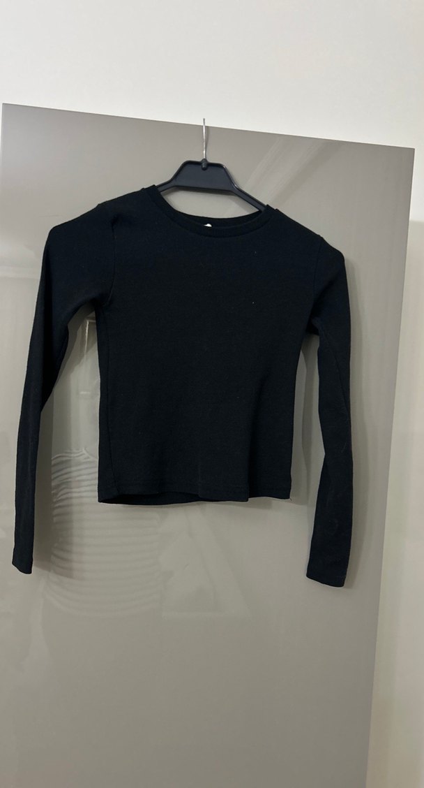 Siyah, uzun kollu, yuvarlak yaka ve vücuda oturan kesime sahip kadın kazak. Düz ve normal midi boyunda, yumuşak sentetik kumaştan günlük kullanım için uygun.