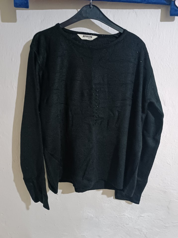 Siyah keten kumaştan, uzun kollu ve yuvarlak yakalı, rahat kesim basic kadın kazak. Minimalist ve desen içermeyen tasarımıyla günlük sokak stiline uygundur.