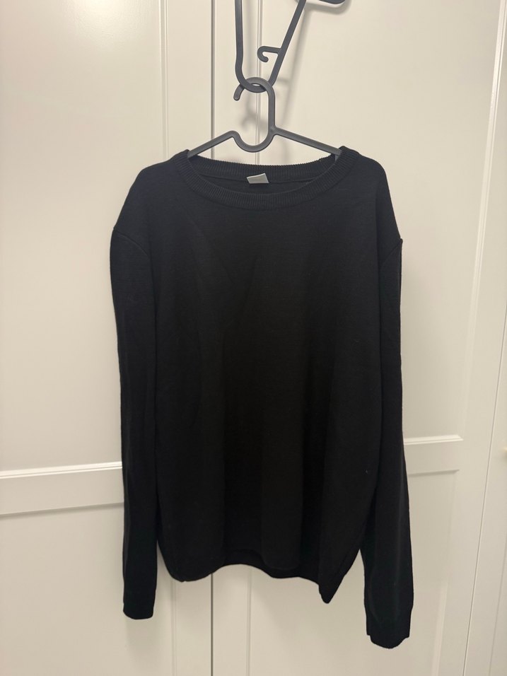 Siyah, uzun kollu, keten kumaştan yapılmış, bol kesim ve yuvarlak yakalı erkek kazak. Minimalist ve günlük kullanıma uygun şık tasarım.