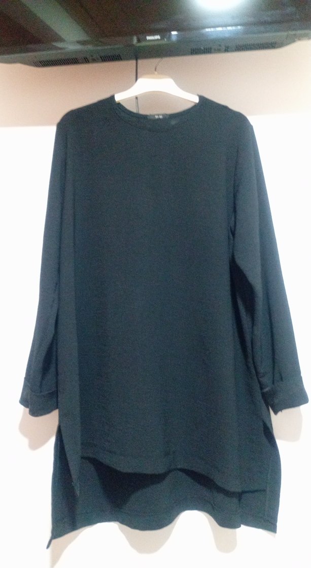 Siyah renkte, uzun kollu ve yuvarlak yakalı keten kumaştan yapılmış bol kesim midi uzunlukta basic tunik.