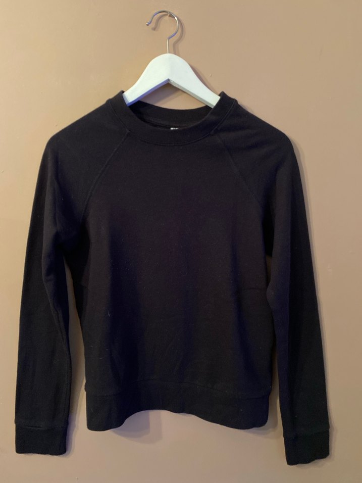 Siyah, uzun kollu, yuvarlak yaka ve normal kesim sweatshirt. Günlük kullanıma uygundur.