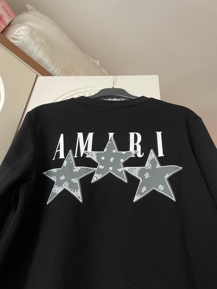 Sokak stilinde, deri malzemeden yapılmış, baskılı yıldızlar ve yazı detayı bulunan, siyah uzun kollu bol kesim erkek tişörtü.