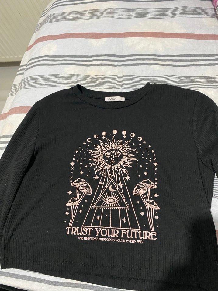 Siyah, uzun kollu, baskılı kadın tişörtü. Göğüs kısmında göksel desenler ve "TRUST YOUR FUTURE" yazısı bulunur. Dar kesim, yuvarlak yaka, sentetik kumaş.