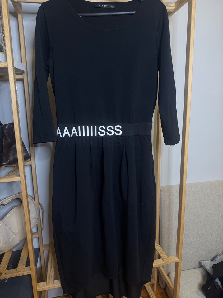 Siyah uzun kollu elbise, bol kesim ve bisiklet yaka ile tasarlanmıştır. Kuşaklı beli ve hafif baskılı deseniyle günlük sokak modasına uygundur.