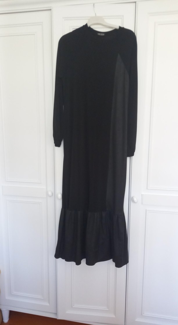 Siyah renkte, uzun kollu ve yüksek yakalı bu uzun elbise, salaş ve drapeli kesime sahip olup sentetik kumaştan üretilmiştir. Gotik tarzıyla günlük kullanıma uygundur.