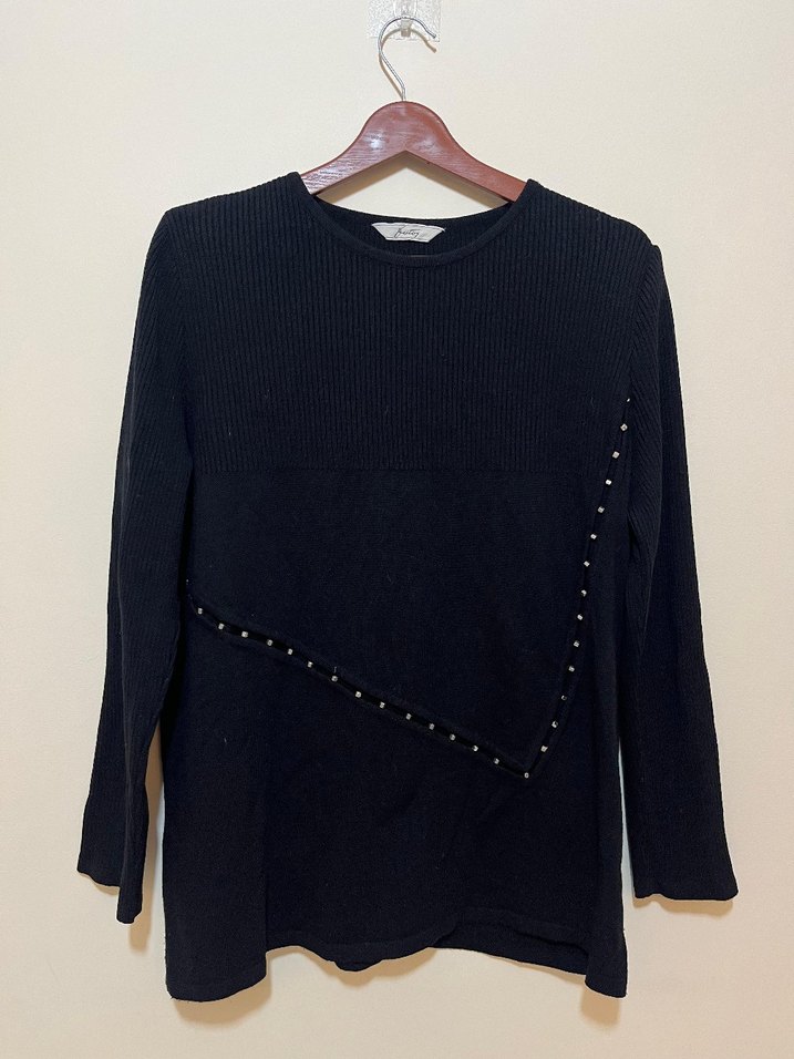 Siyah uzun kollu, yuvarlak yakalı ve bol kesim örgü kazak. İnce boncuk detayları ve minimal gotik tarzıyla günlük kullanım için uygundur.
