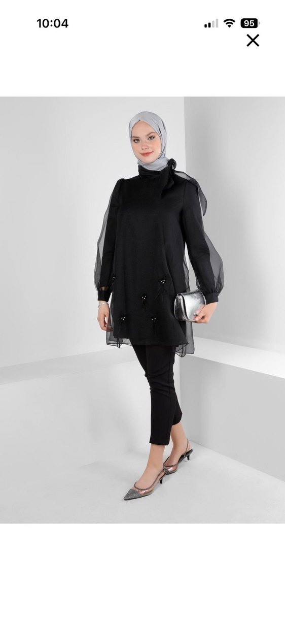 Siyah, bol kesim kadın tunik, boğazlı ve uzun, drapeli kollara sahiptir. Kısa boyu ve çağdaş gotik tarzı gündelik kullanıma uygundur. Kumaşı sentetik ve yumuşaktır, hafif süslemelidir. Abiye tek üst penyeli