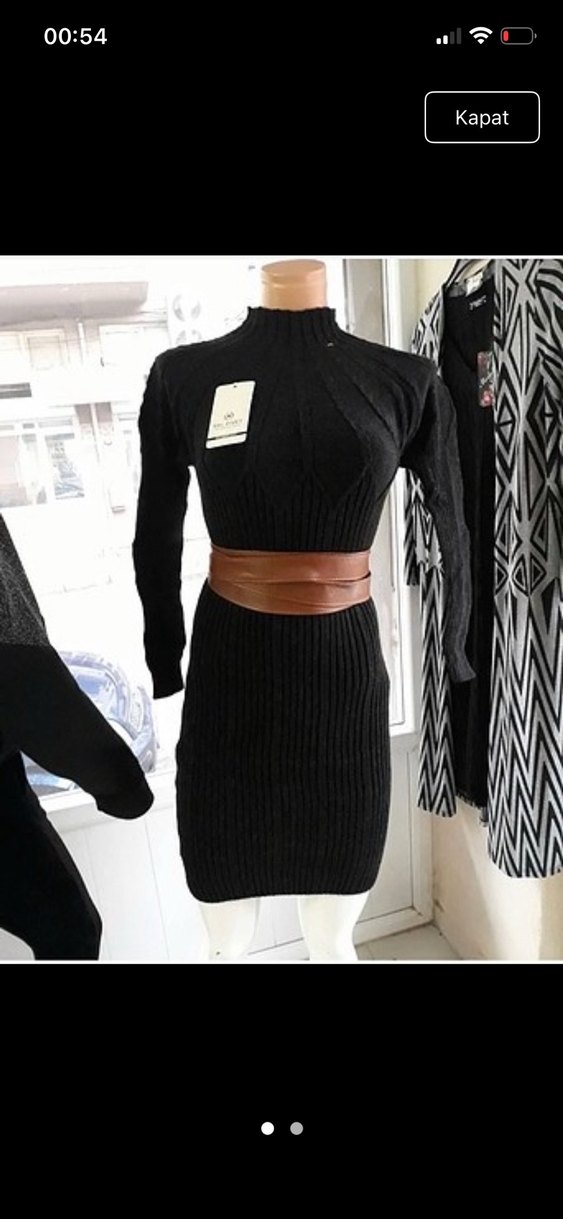 Bu siyah triko elbise, uzun kollu, boğazlı ve kemerli olup modern ve rahat bir görünüm sunar. Günlük kullanıma uygundur. Gri rengi de var