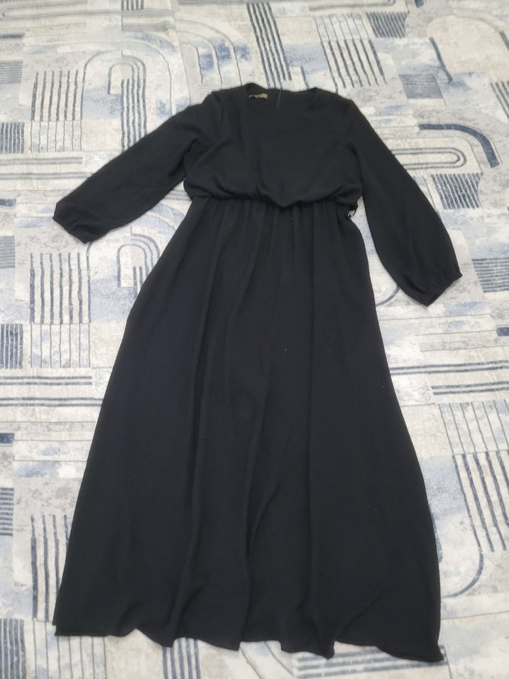 Siyah uzun kollu, bol kesim, drapeli bohem elbise. Tek renk, tekne yaka ve yumuşak sentetik kumaştan, günlük kullanıma uygun klasik ve minimalist tarz.