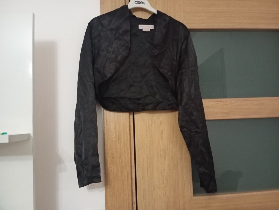 Düz siyah, uzun kollu bolero. Yumuşak sentetik saten parlak kumaştan üretilmiştir.