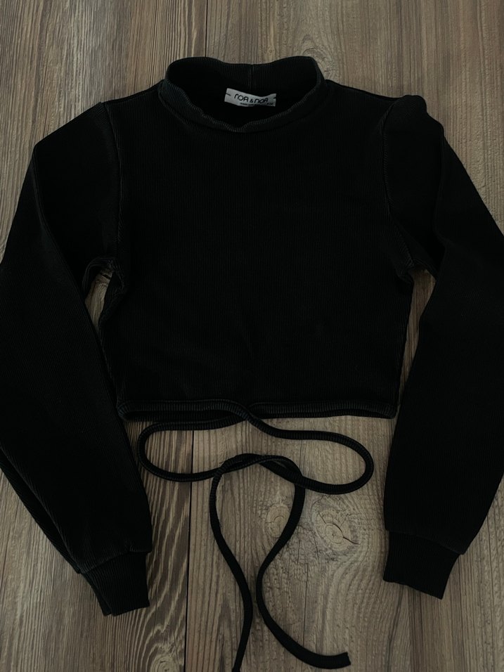 siyah, crop kesim, yumuşak, goth tarzında, boyunlu ve belden bağlamalı uzun kollu marka temsili